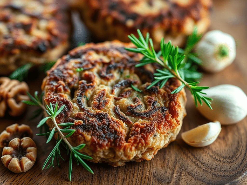 Earthy mushrooms and toasted walnuts form the base of these savory patties, bound with oats and chickpea flour for a crisp edge and tender bite. 😊